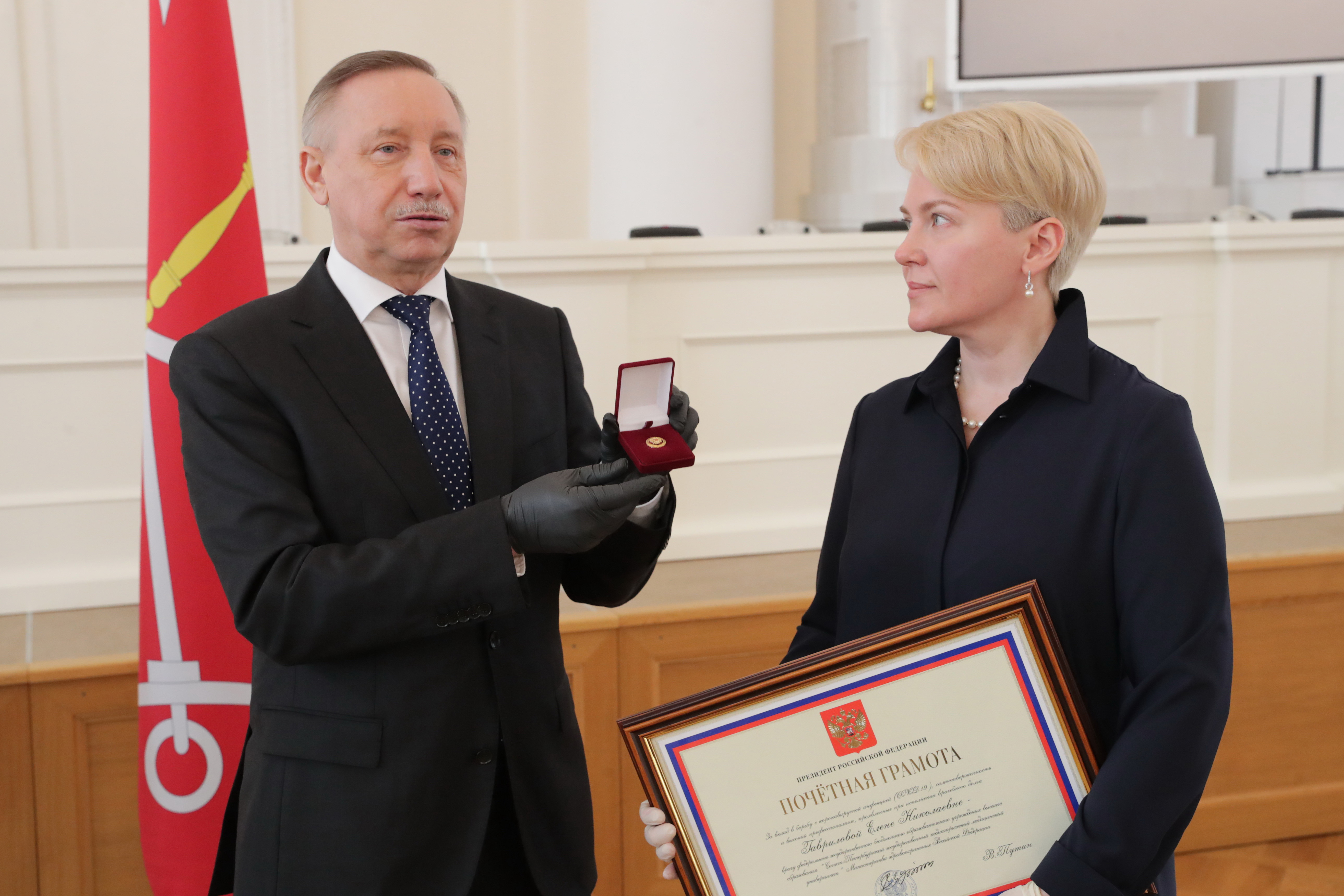 По поручению Владимира Путина правительственными грамотами наградили врачей Елену Гаврилову, Евгению Гольцман, Анну Набиеву, Алису Перерослую, Екатерину Соловьеву, заведующего отделением анестезиологии-реанимации Евгения Фелькера, а также заведующую лабораторией вуза Лилию Марапулец. Кроме того, 12 сотрудников СПбГПМУ получили из рук градоначальника благодарности Президента.