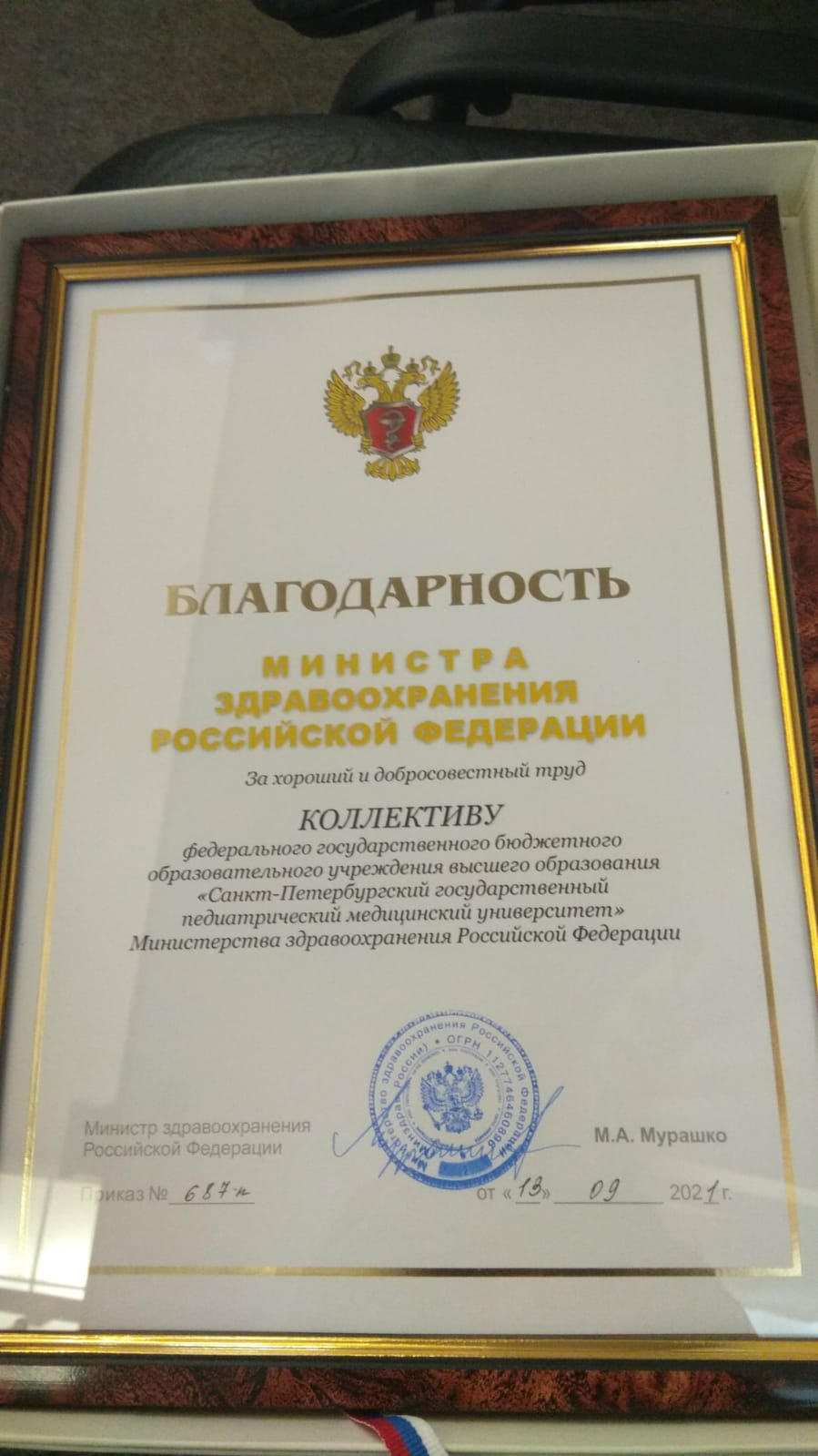 На встрече присутствовал ректор Педиатрического медицинского университета Дмитрий Иванов. Глава вуза получил благодарность Министра здравоохранения за добросовестный труд коллектива университета.