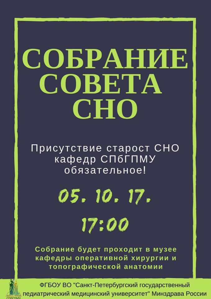 Собрание совета Студенческого Научного Общества СПбГПМУ состоится 5.10.2017 г. в 17:00 в музее кафедры оперативной хирургии и топографической анатомии!