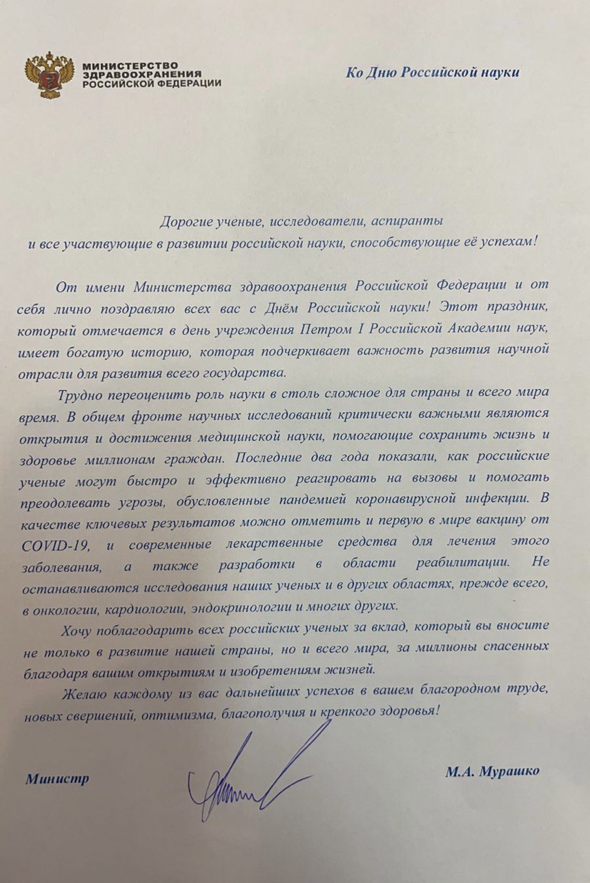 Поздравление министра здравоохранения с Днем науки
