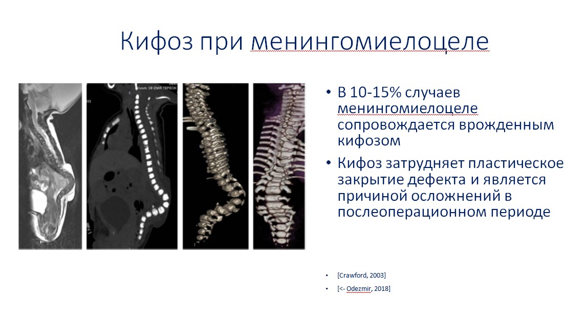 В 10% случаев менингомиелоцеле сопровождается кифозом – деформацией позвоночника. Дети с такой патологией лишены возможности ходить, а костный выступ не позволяет им лежать на спине или сидеть в инвалидном кресле. На месте костного выступа атрофируется кожный покров, возникают трофические язвы. Рёбра пациента соприкасаются с тазовыми костями, причиняя ему боль. Чтобы улучшить качество жизни ребёнка, необходимо убрать острый горб.