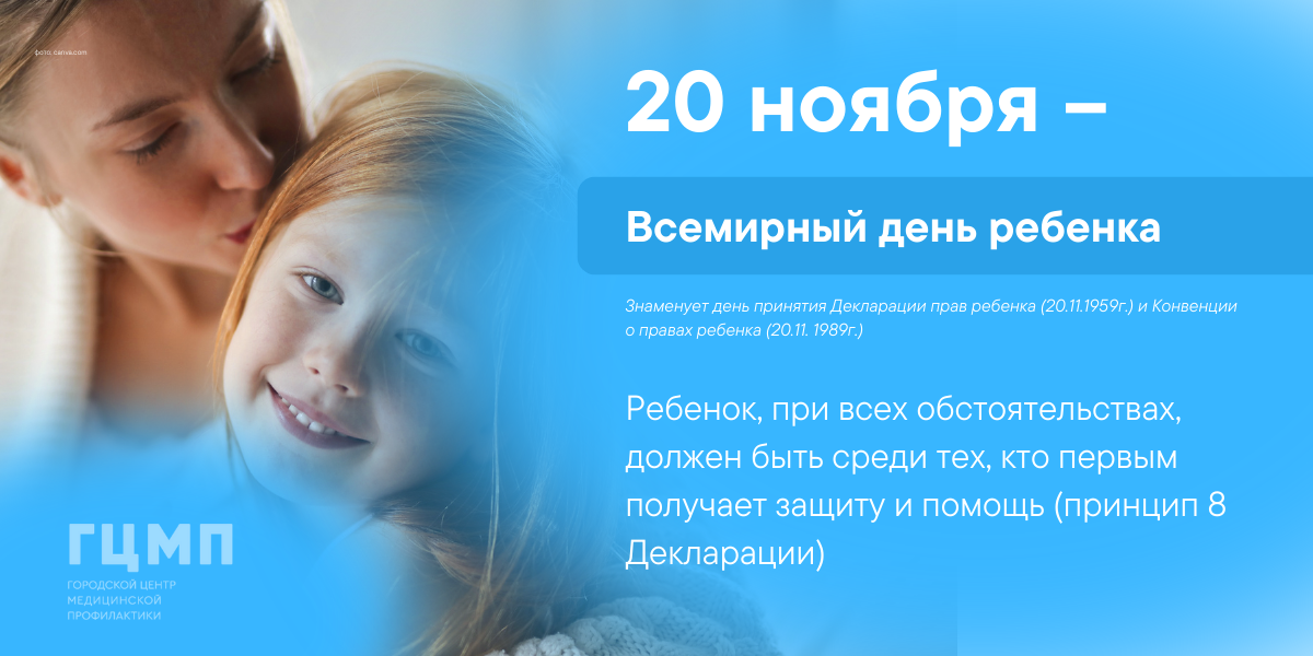 Всемирный день ребенка (Universal Children's Day) отмечается ежегодно 20 ноября. В 1954 году Генеральная Ассамблея ООН рекомендовала всем странам ввести в практику празднование этой даты, как дня мирового братства и взаимопонимания детей, посвященного деятельности, направленной на обеспечение благополучия детей во всем мире.