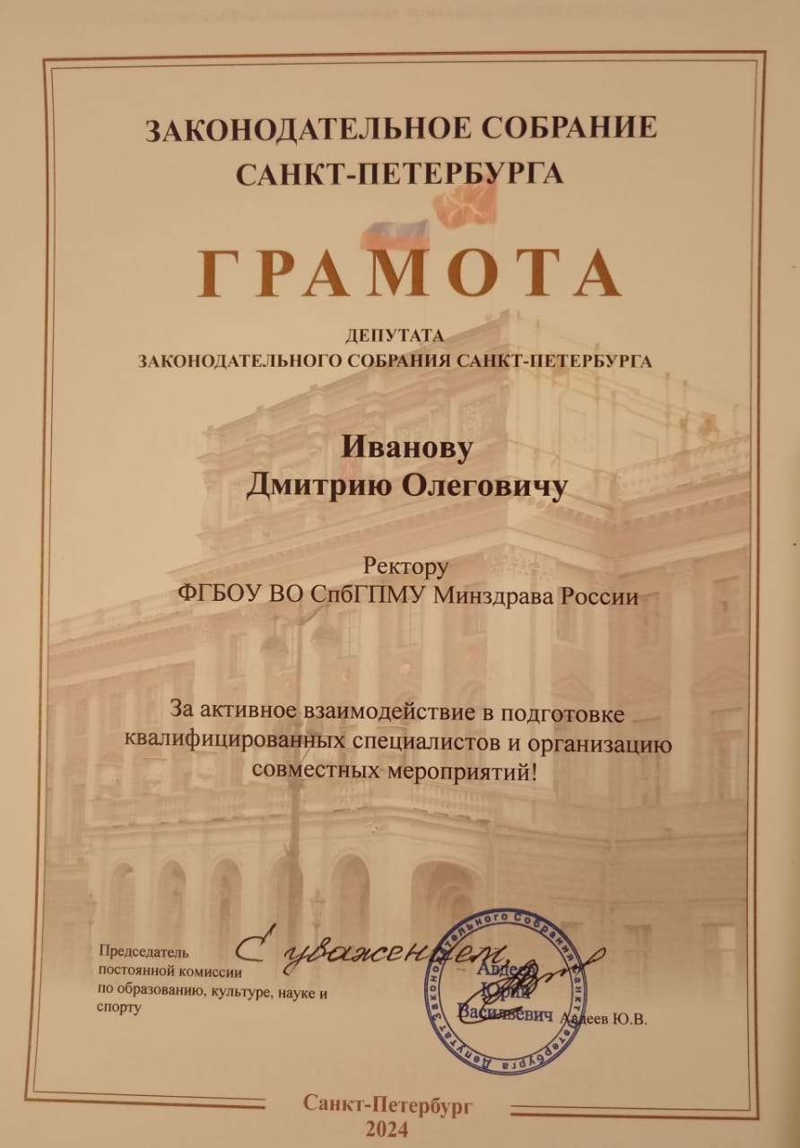 Председатель постоянной комиссии по образованию, культуре, науке и спорту Юрий Авдеев наградил вуз в лице ректора, главного неонатолога Министерства здравоохранения Российской Федерации Дмитрия Иванова грамотой. Она дана за активное взаимодействие в подготовке квалифицированных специалистов и организацию совместных мероприятий.