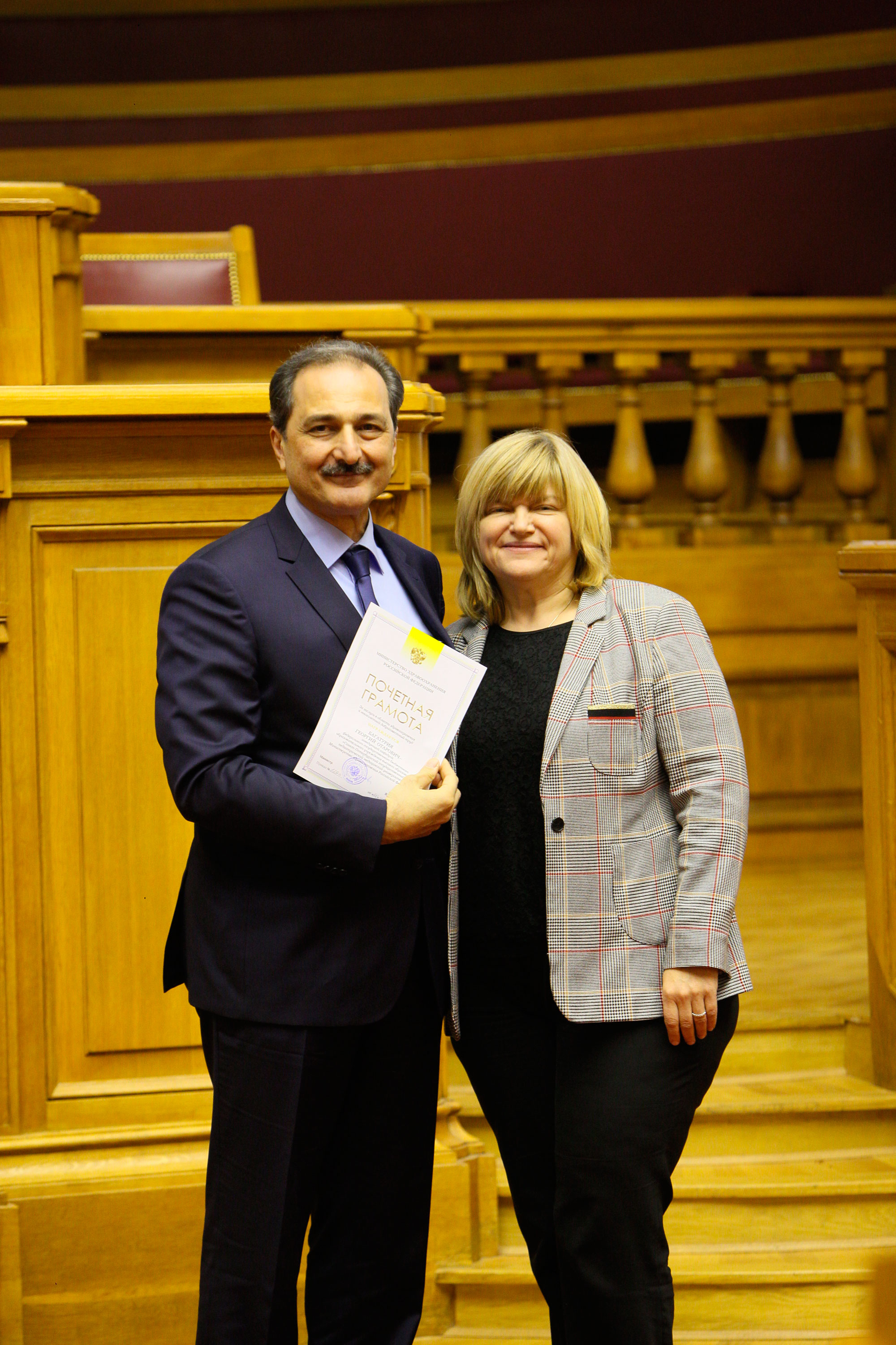 Председатель комиссии по социальной политике и здравоохранению Законодательного собрания Санкт-Петербурга Елена Юрьевна Киселева вручила Почетный Диплом Законодательного собрания Санкт-Петербурга коллективу Санкт-Петербургского государственного педиатрического медицинского университета. Кроме того, Почетными Грамотами председателя Законодательного собрания Санкт-Петербурга были награждены: доцент кафедры патологической физиологии с курсом иммунопатологии Беляева Ирина Васильевна, доцент кафедры общей гигиены Васильев Юрий Валерианович, заведующий кафедрой дерматовенерологии Горланов Игорь Александрович, заведующий кафедрой анестезиологии, реанимации и неотложной педиатрии им. профессора В.И. Гордеева Заболотский Дмитрий Владиславович, заведующий кафедрой гистологии и эмбриологии им. проф. А.Г. Кнорре Кожухарь Владимир Гарибальдиевич, проректор по научной работе Насыров Руслан Абдуллаевич, помощник ректора по воспитательной работе Погорельчук Виктор Викторович.