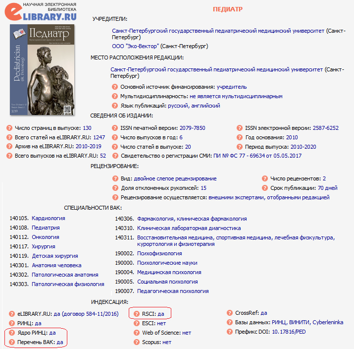 Научно-практический журнал «Педиатр», созданный в 2010 году в Санкт-Петербургском государственном педиатрическом медицинском университете, включенный с 2015 года в Перечень рецензируемых научных изданий, рекомендованных ВАК для публикаций результатов диссертационных исследований, а с прошлого года – в дополнительный список изданий - кандидатов на включение в RSCI, в конце марта 2020 года вошел в ядро РИНЦ и в Russian Science Citation Index (RSCI) на платформе Web of Science.