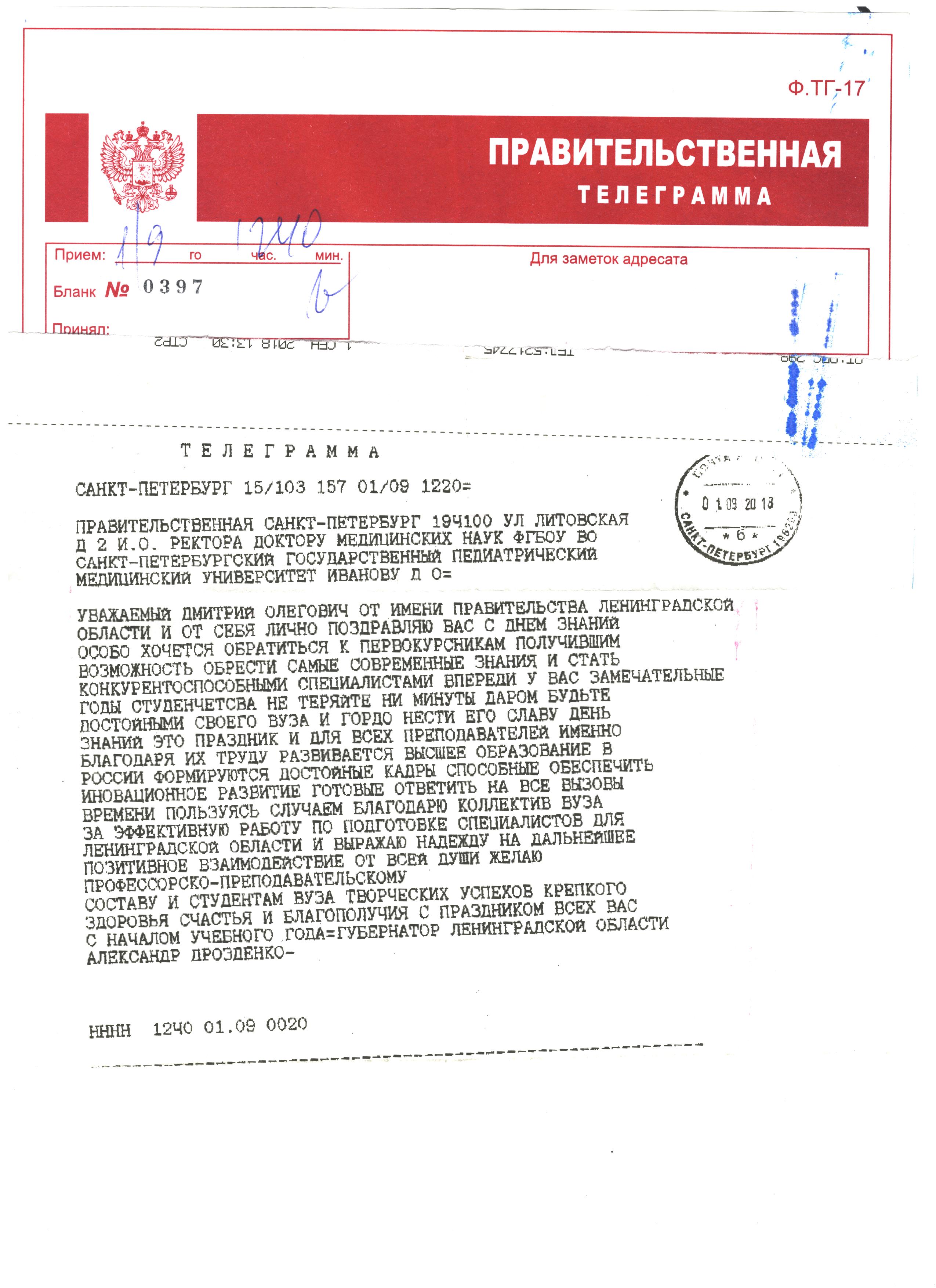 Поздравительная телеграмма с Днем знаний от Губернатора Ленинградской области А. Дрозденко