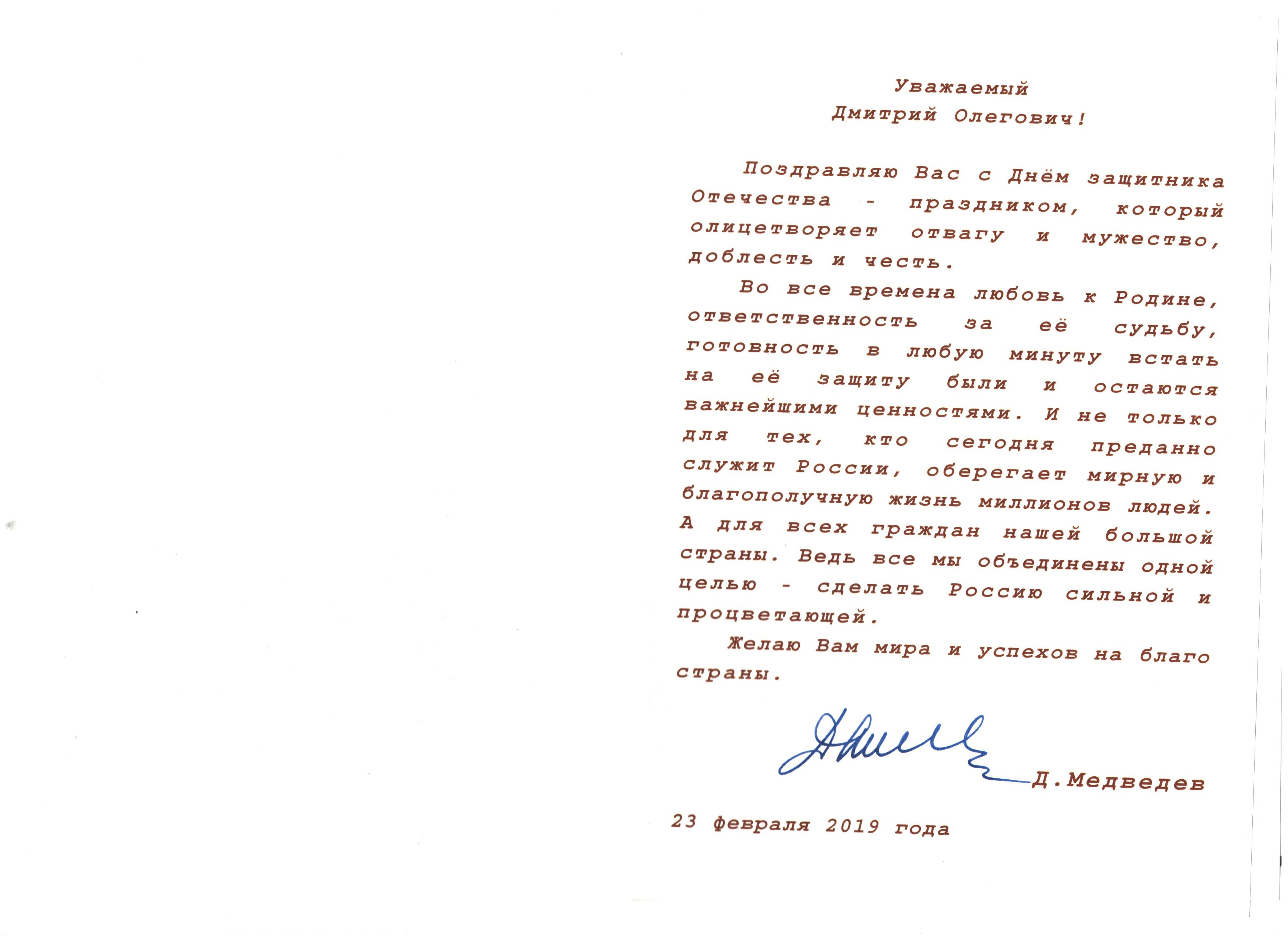 Поздравление с Днем защитника Отечества от имени Председателя Правительства Российской Федерации Дмитрия Анатольевича Медведева