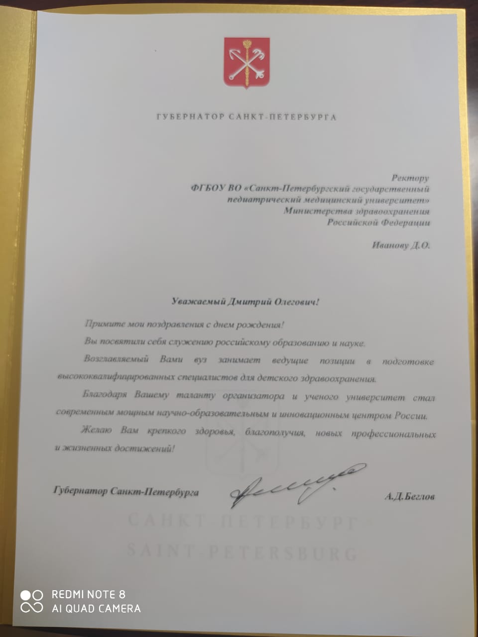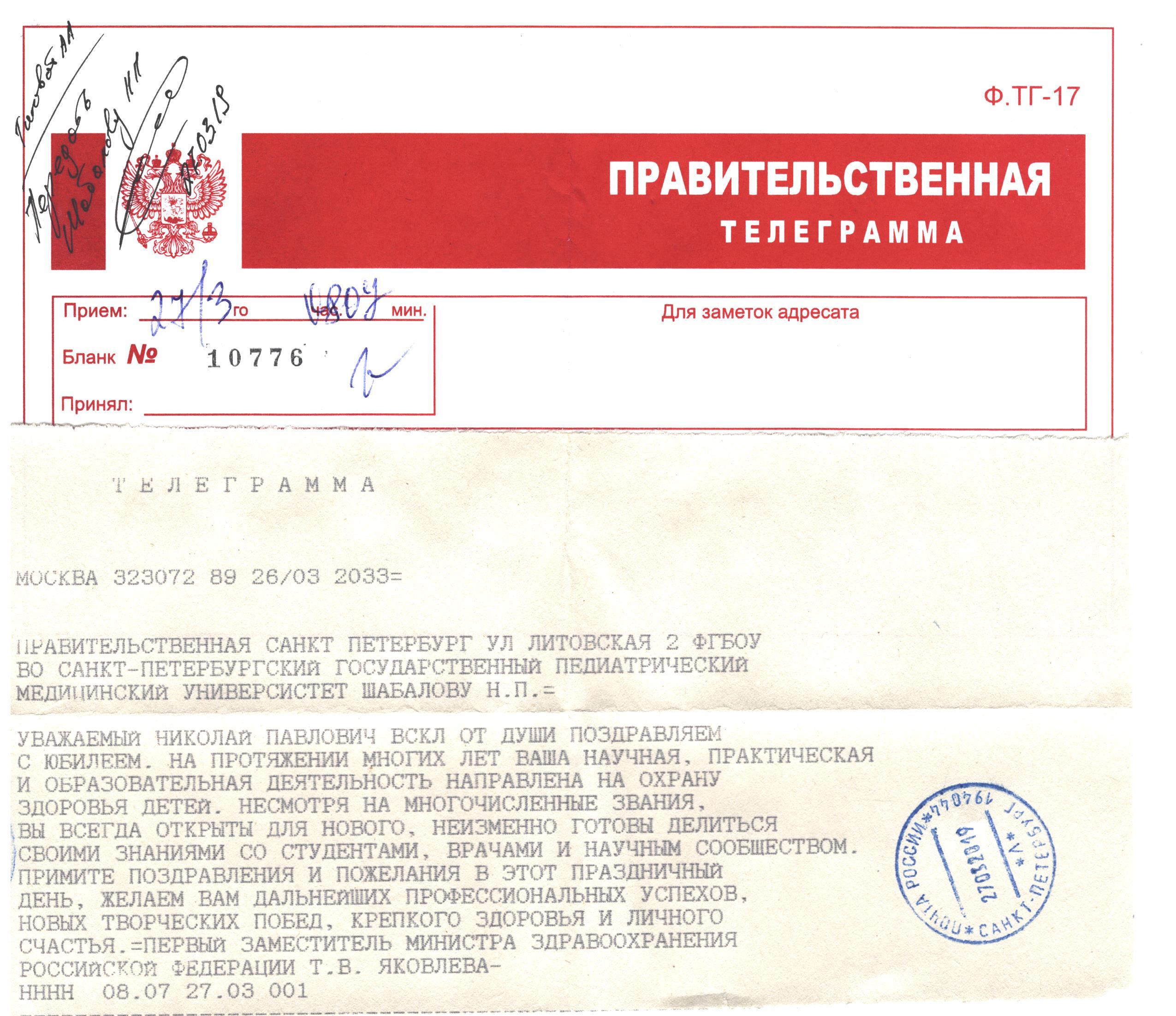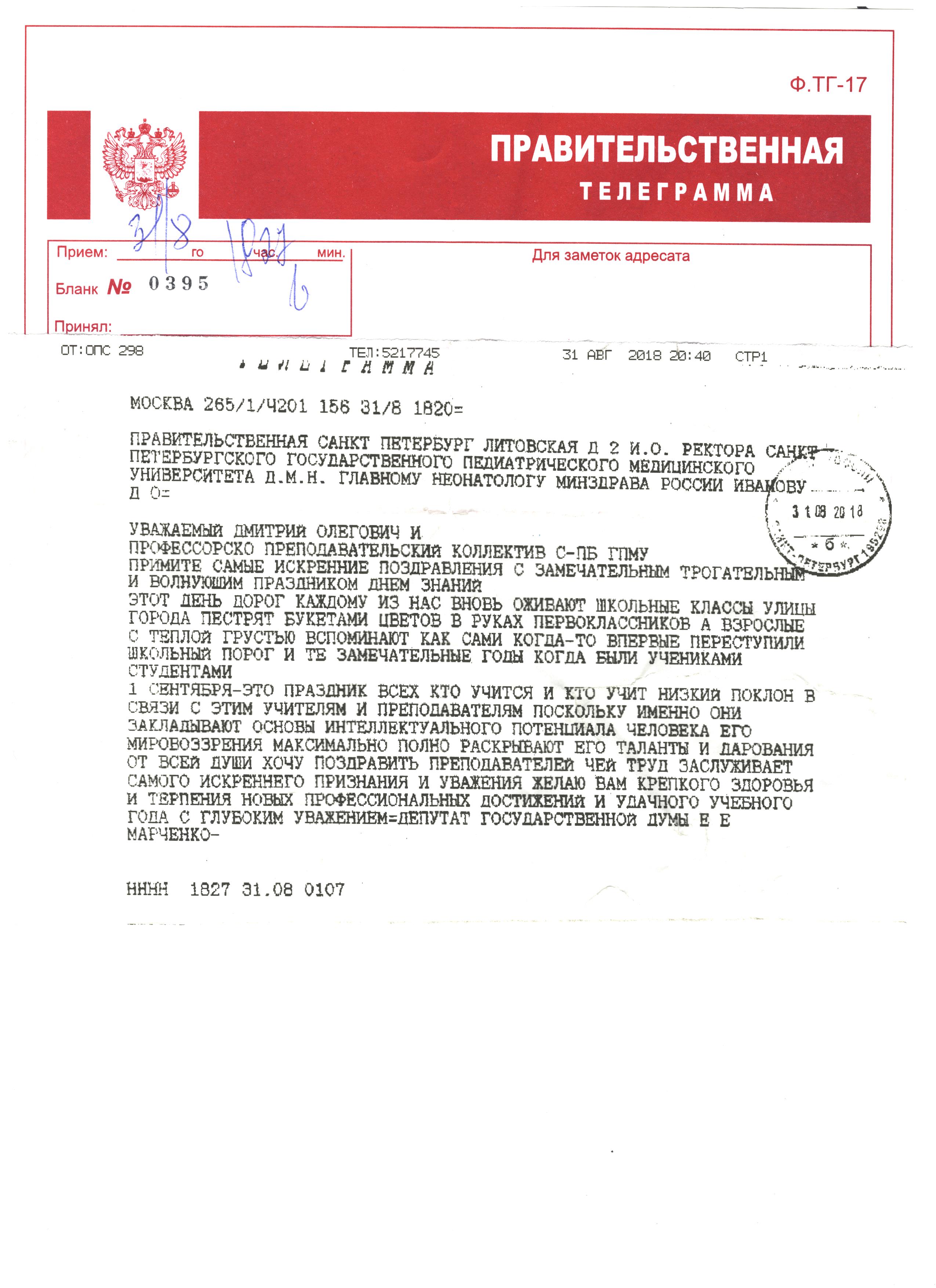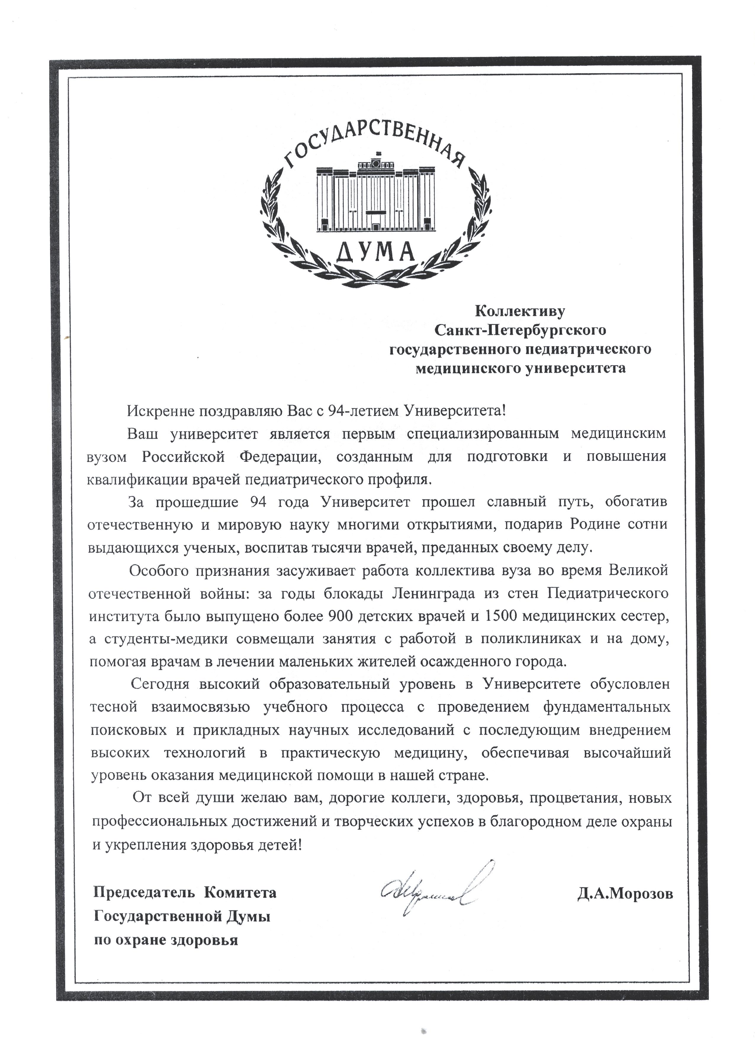 Правительственная телеграмма от Председателя комитета по охране здоровья Государственной Думы РФ Д.А. Морозова с поздравлением в адрес вуза в честь 94-летия СПбГПМУ и 114-летия Клиники вуза