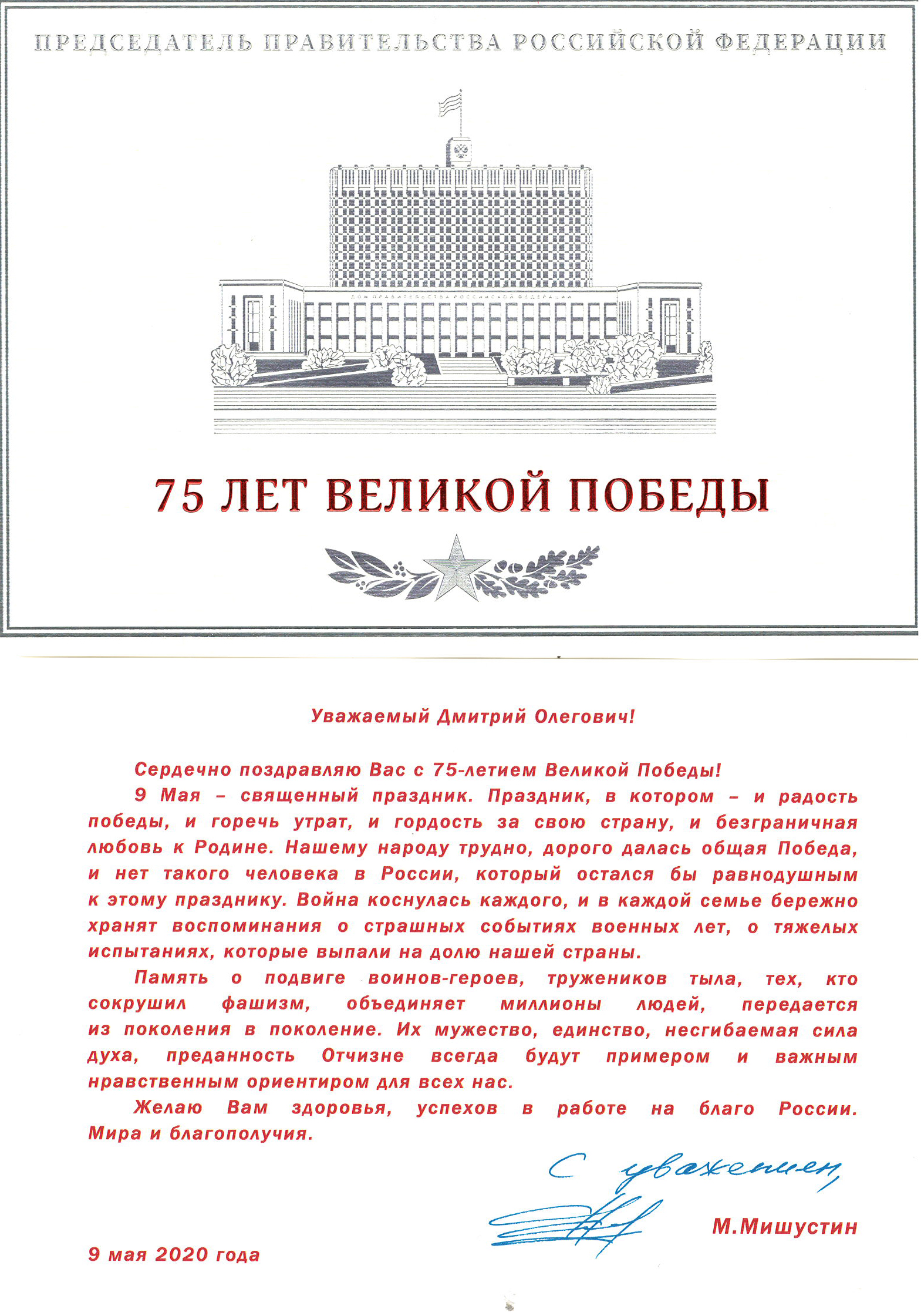 Поздравление ректора СПбГПМУ, главного неонатолога Минздрава России Д.О. Иванова с Днем России от Председателя Правительства РФ Д.А. Медведева