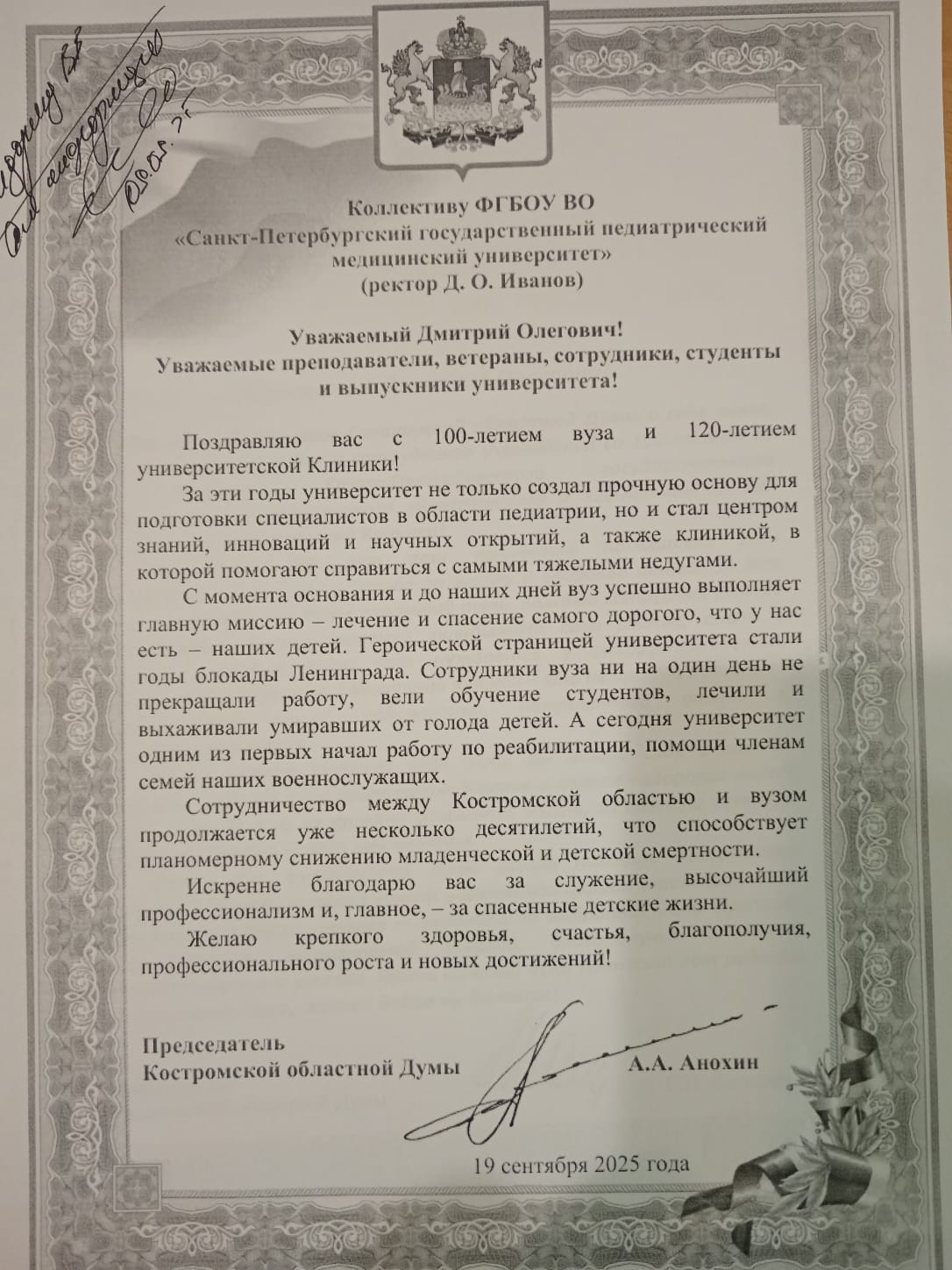 Поздравление председателя Костромской областной думы А.А. Анохина