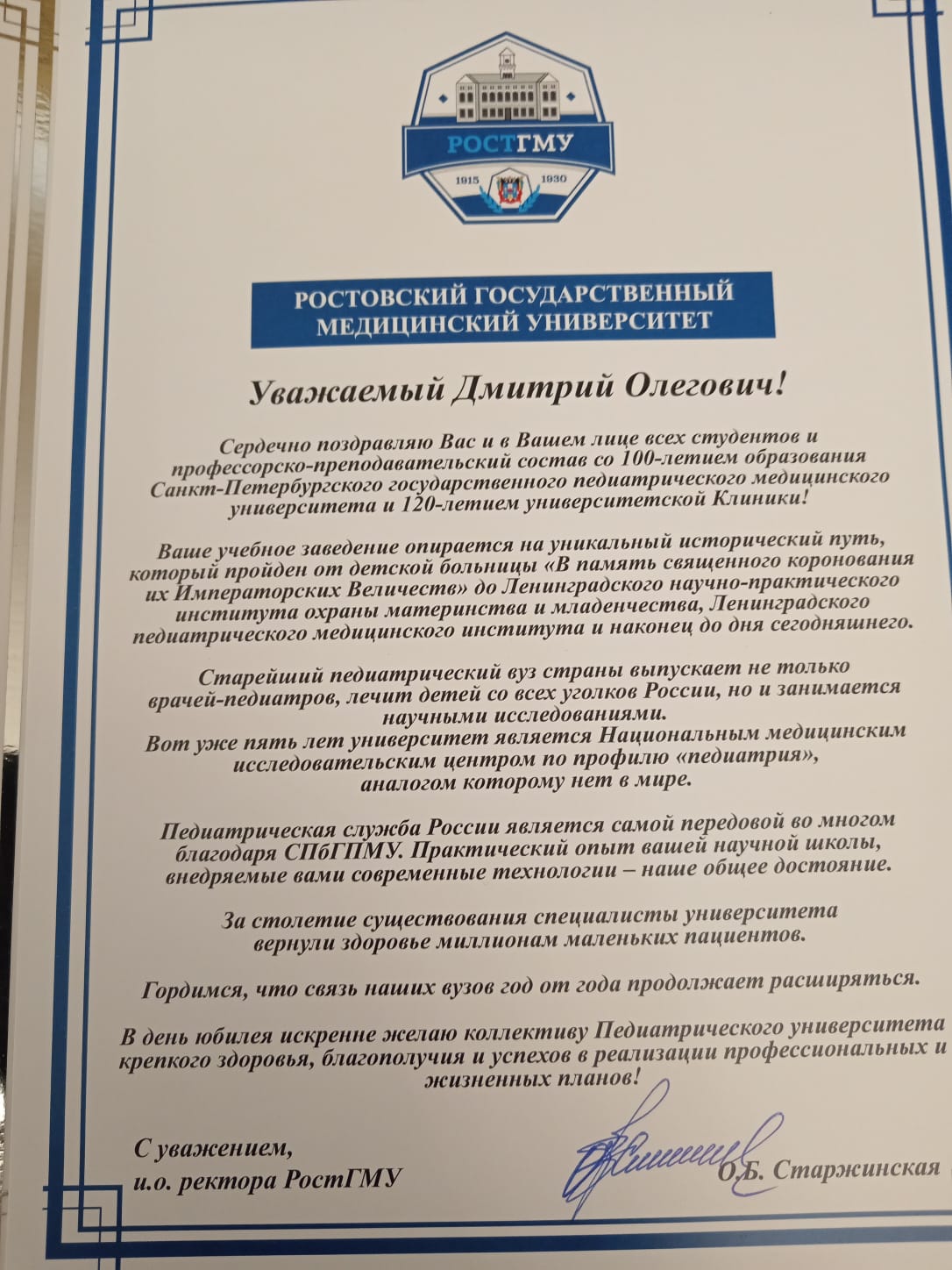 Поздравление от ио ректора Ростовского государственного медицинского университета